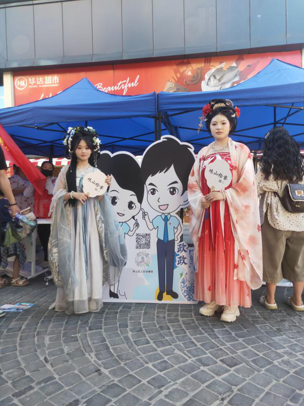 活动当天,检察干警在醒目位置设立普法宣传台,身着检察制服的身影与古色古香的建筑相映成趣。考虑到夏日炎热,他们还特意准备了印有检察服务热线和青花图案的文创团扇,为驻足咨询的群众送上清凉。团扇上,“珠山检察”字样与青花瓷纹样相得益彰,既实用又具纪念意义,深受大家喜爱,引众人排队领取。