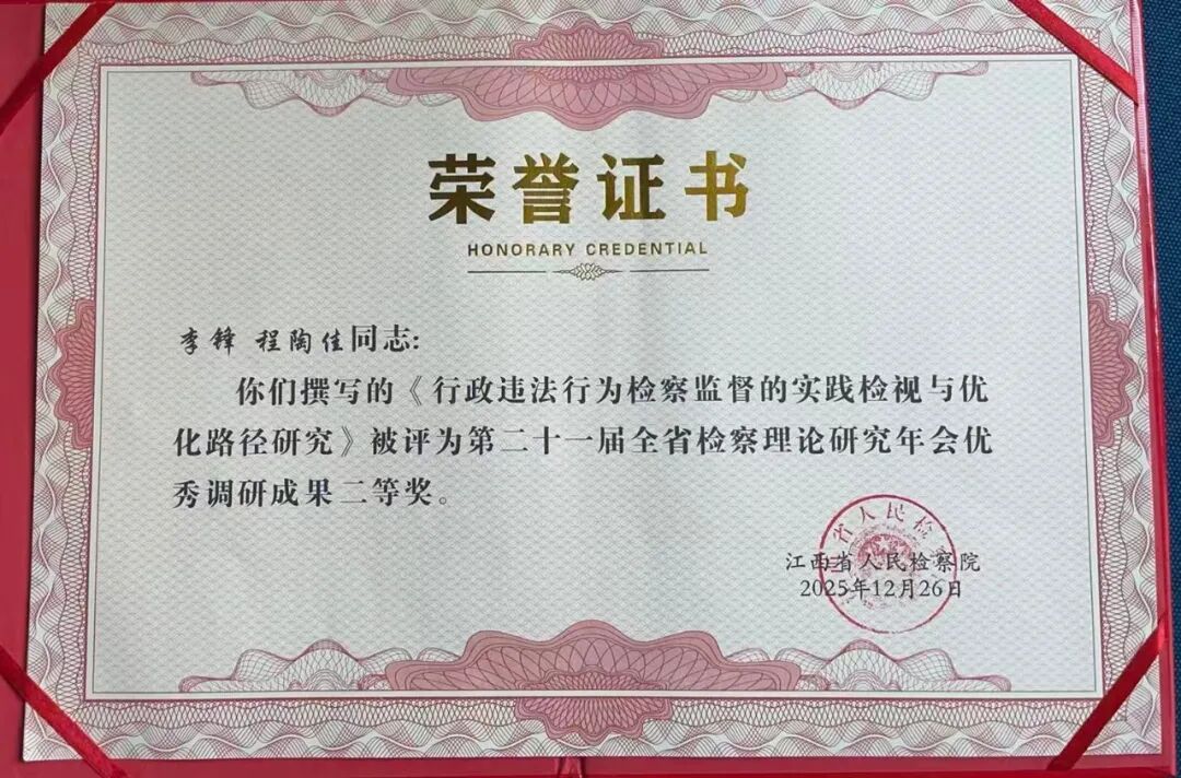 李锋 程陶撰写的《行政违法行为检察监督的实践检视与优化路径研究》被评为第二十一届全省检察理论研究年会优秀调研成果二等奖。