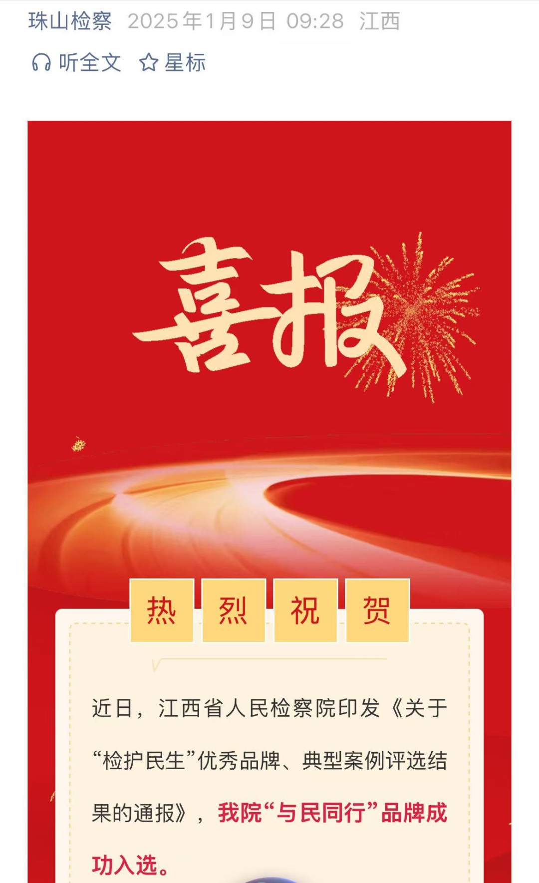1月9日,江西省人民检察院印发《关于“检护民生”优秀品牌、典型案例评选结果的通报》,“与民同行”品牌成功入选。