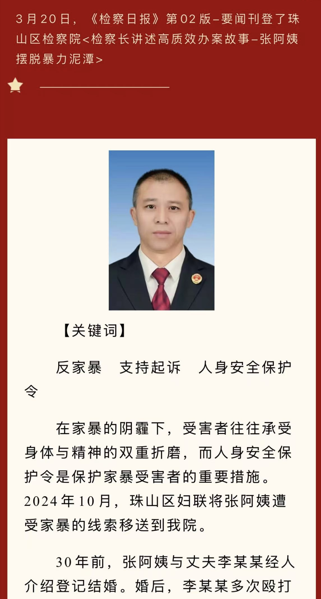 《检察日报》第02版-要闻刊登珠山区检察院<检察长讲述高质效办案故事-张阿姨摆脱暴力泥潭>。