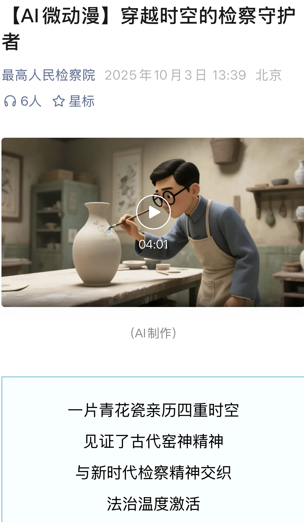 右图:创作的微动漫《穿越时空的检察守护者》被最高人民检察院微信公众号发布。
