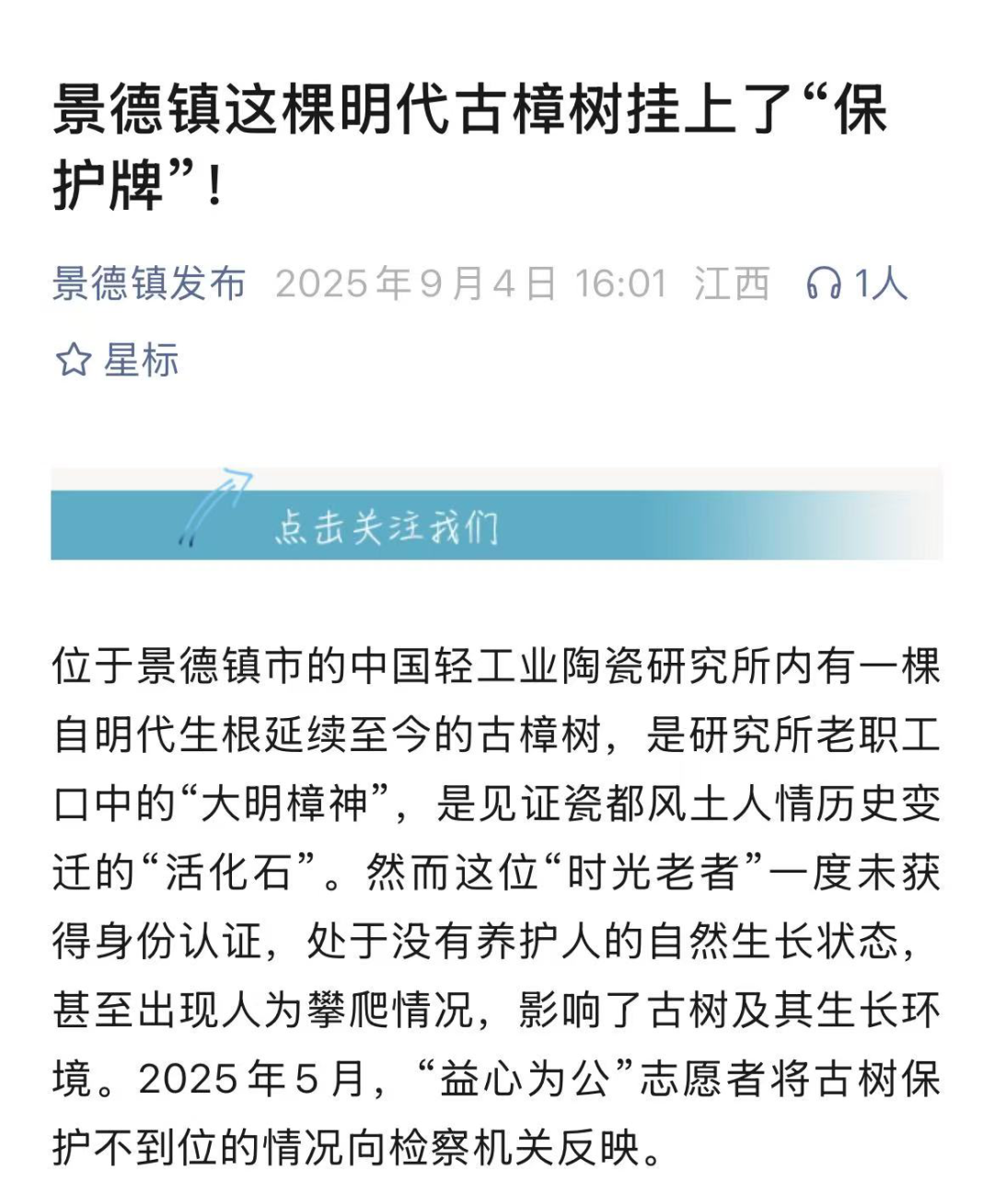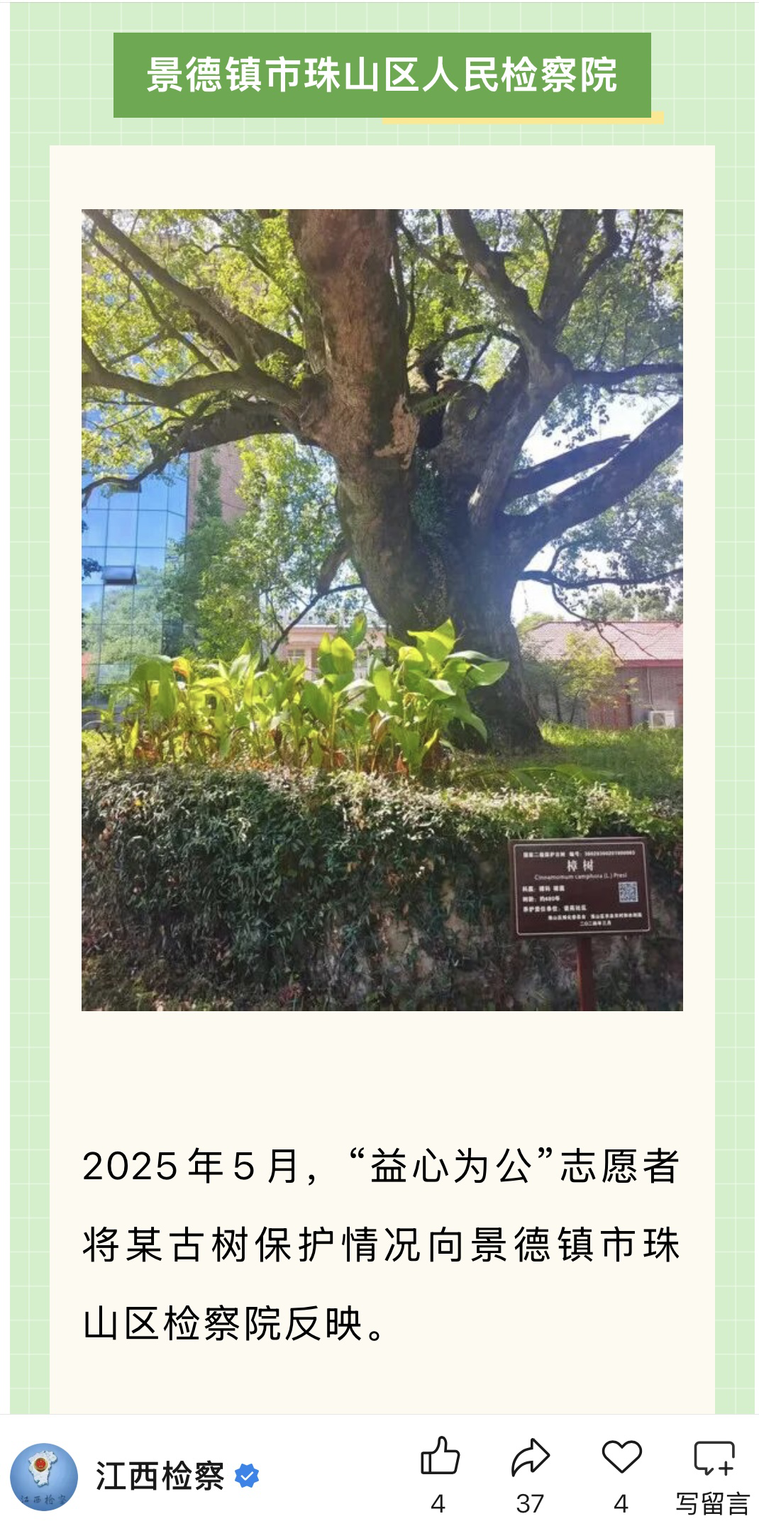 深入开展古树名木保护公益诉讼专项行动,督促行政机关依法履行古树名木保护管理监督职责,为一棵明代古樟树挂上“保护牌”,该项工作被《江西检察》、《景德镇发布》微信公众号报道。