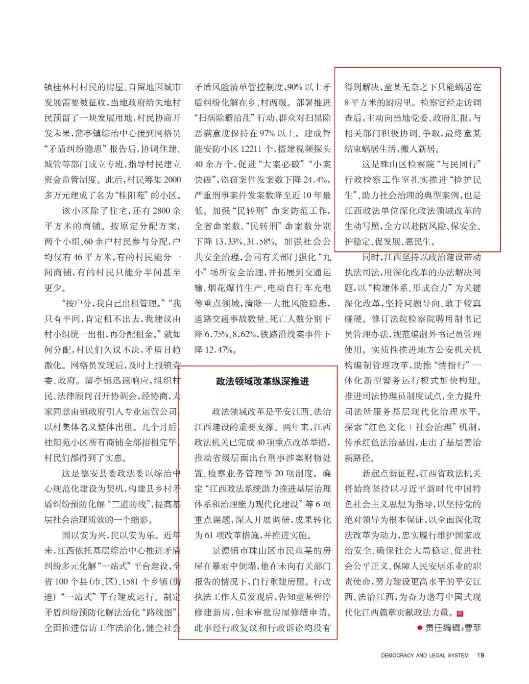 《民主与法制》以“绘就平安江西法治江西新图景”推出系列报道,珠山区人民检察院“与民同行”工作及一案例被写入平安建设专题。