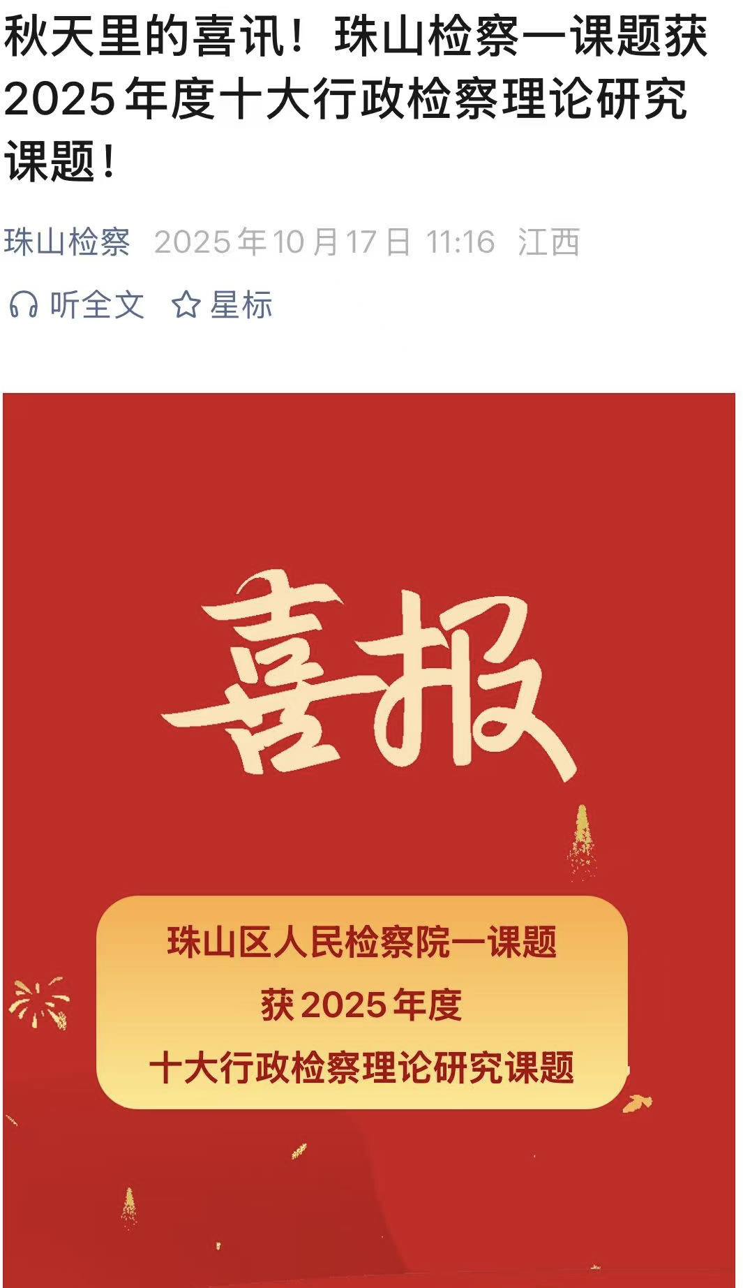 左图:申报的课题《以行政诉讼视角浅论开展行政违法行为监督路径》被最高检确定为“2025年度十大行政检察理论研究课题”。