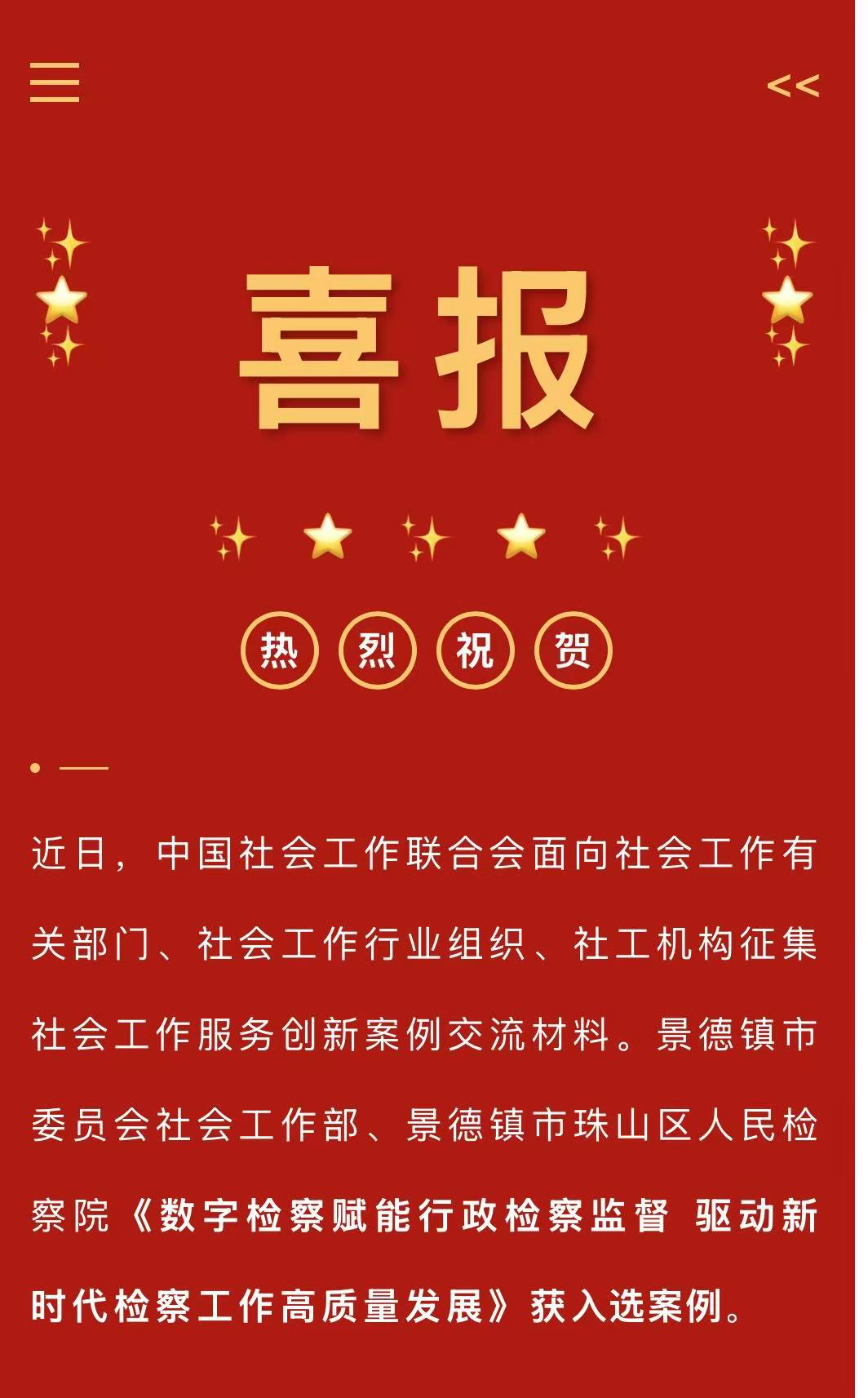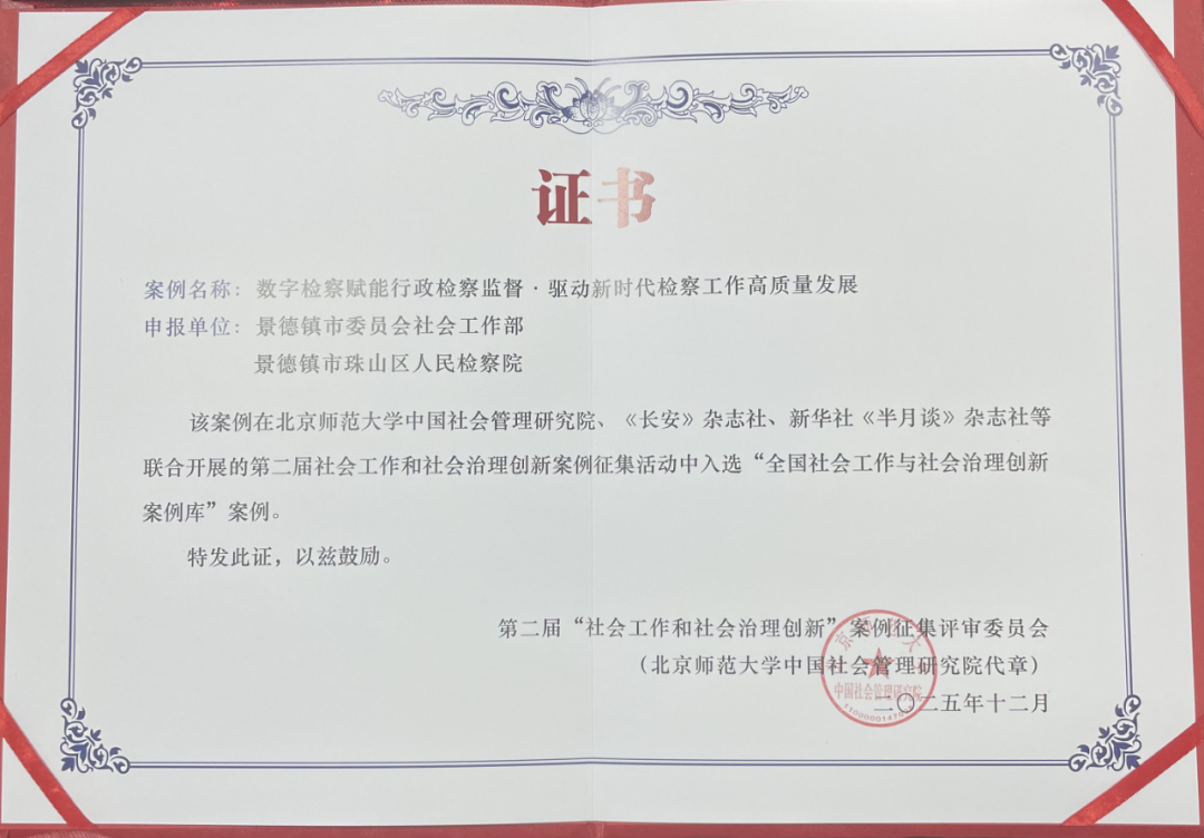 参评的《数字检察赋能行政检察监督 驱动新时代检察工作高质量发展》案例在北京师范大学中国社会管理研究院、《长安》杂志社、新华社《半月谈》杂志社等联合发起的第二届“社会工作和社会治理创新”案例征集活动中被评为入选案例。