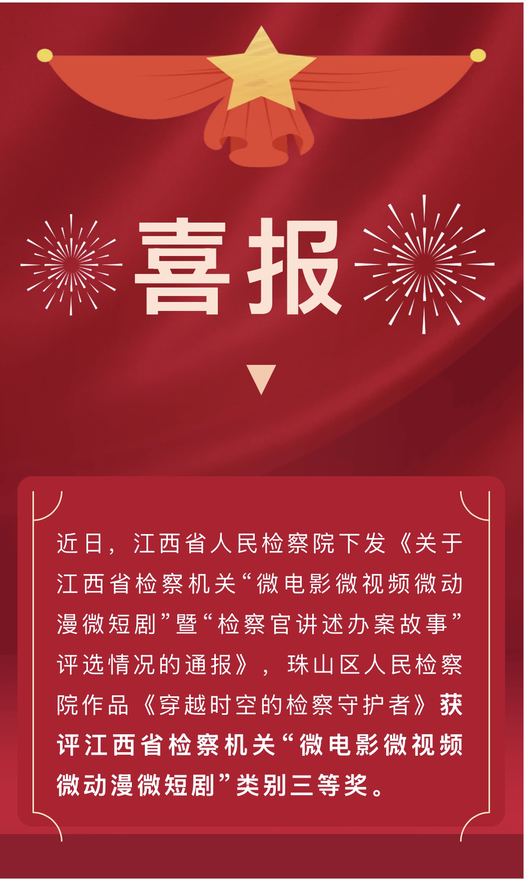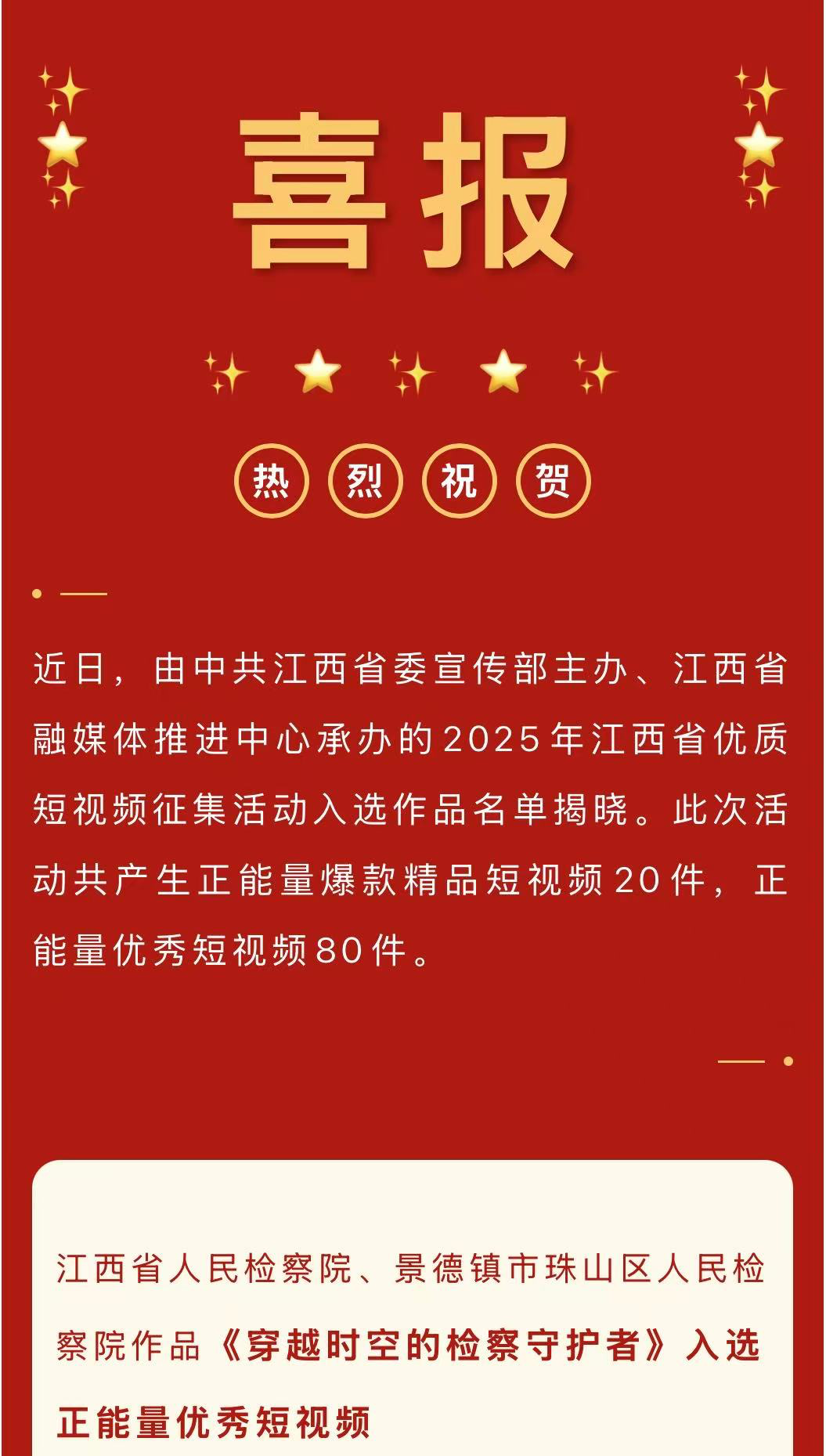 创作的微动漫《穿越时空的检察守护者》在中共江西省委宣传部主办、江西省融媒体推进中心承办的2025年江西省优质短视频征集活动中荣获正能量优秀短视频,并获评江西省检察机关微电影微视频微动漫微短剧类别三等奖。