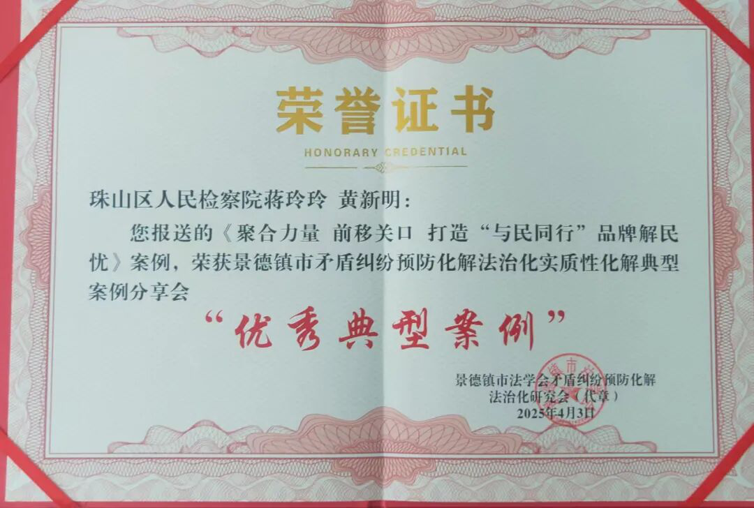 右图:蒋玲玲、黄新明撰写的《聚合力量 前移关口 打造“与民同行”品牌解民忧》案例获评景德镇市矛盾纠纷预防化解法治化实质性化解优秀典型案例。