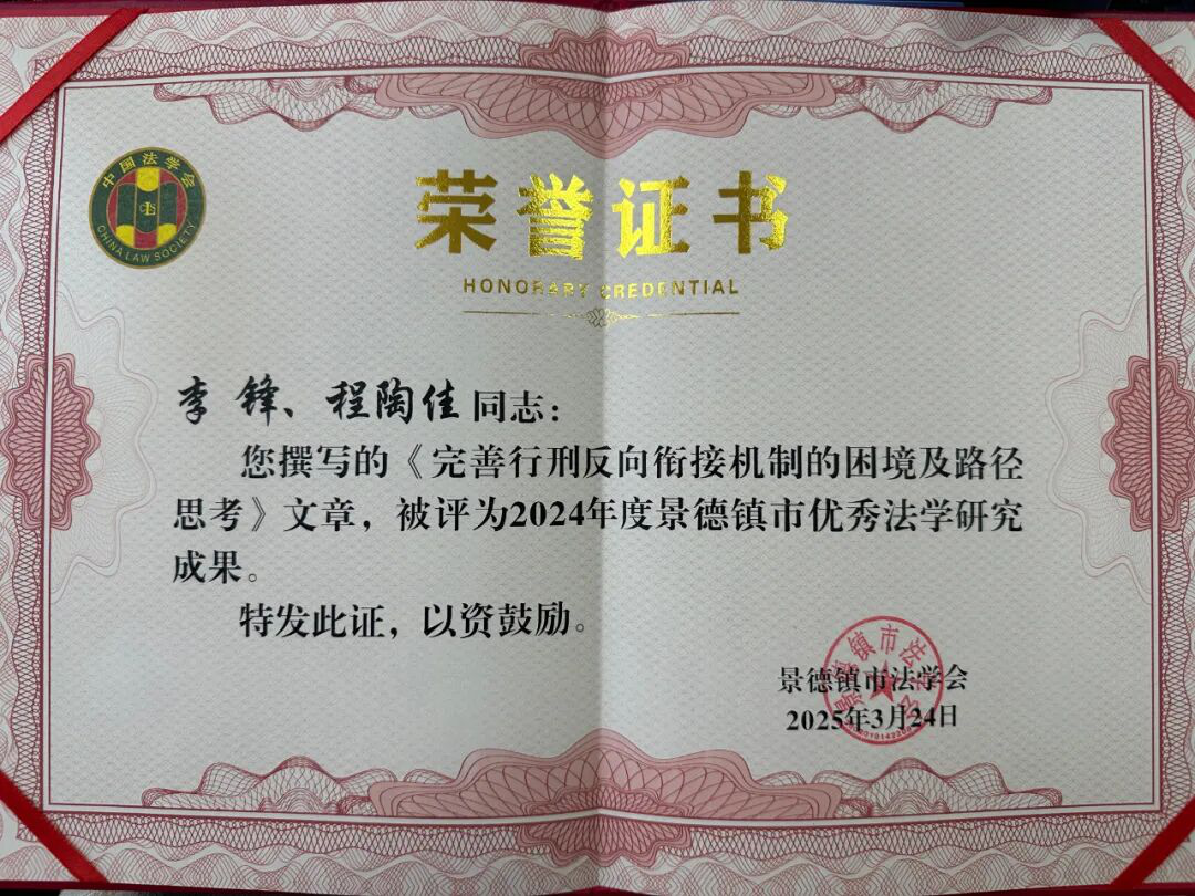 院党组书记、检察长李锋、程陶佳撰写的《完善行刑反向衔接机制的困境及路径思考》获评2024年度景德镇市优秀法学研究成果。