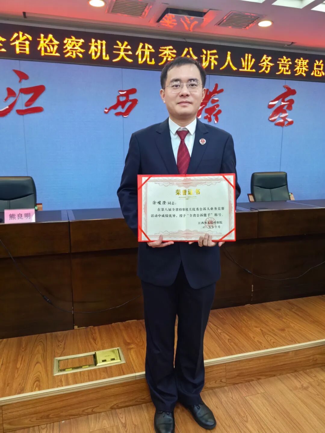 2025年10月20日,江西省人民检察院举办的第八届全省检察机关优秀公诉人业务竞赛落下帷幕,来自全省检察机关的80名选手齐聚南昌,经过激烈角逐,珠山区检察院干警涂峻澄同志荣获“全省公诉能手”称号!