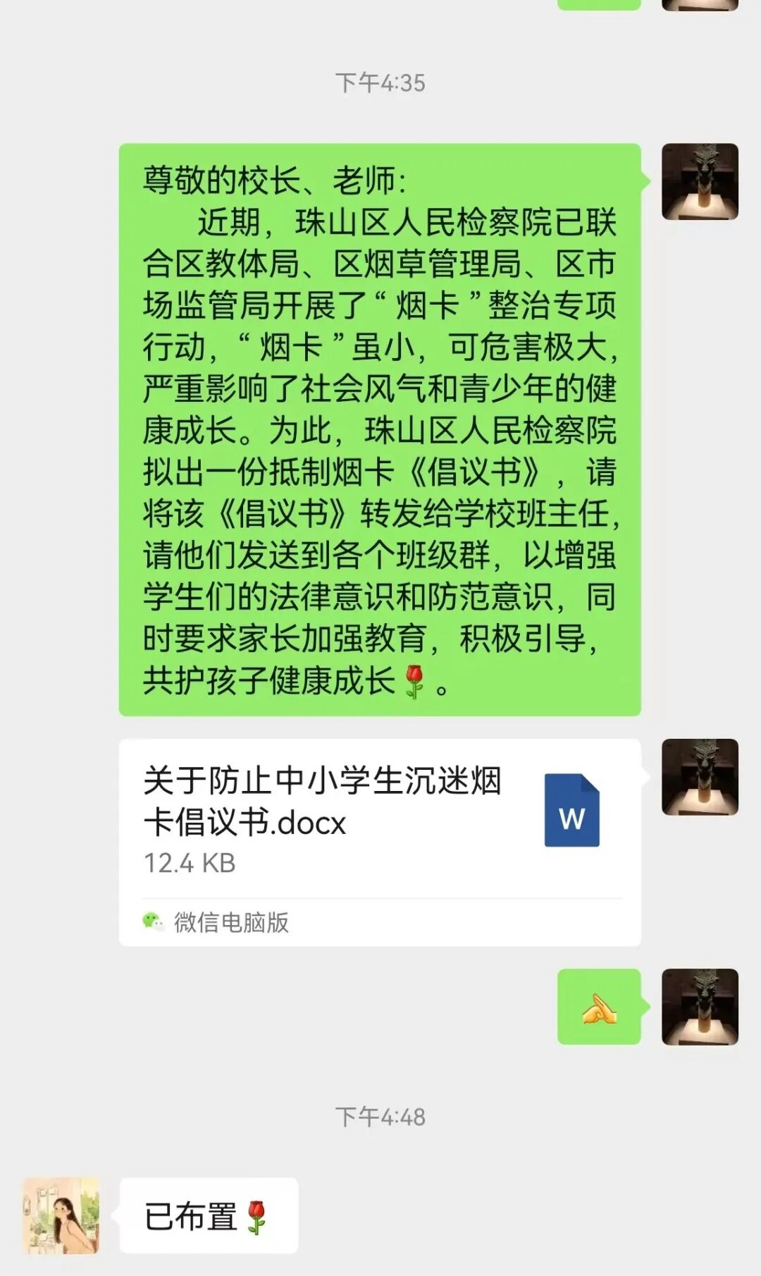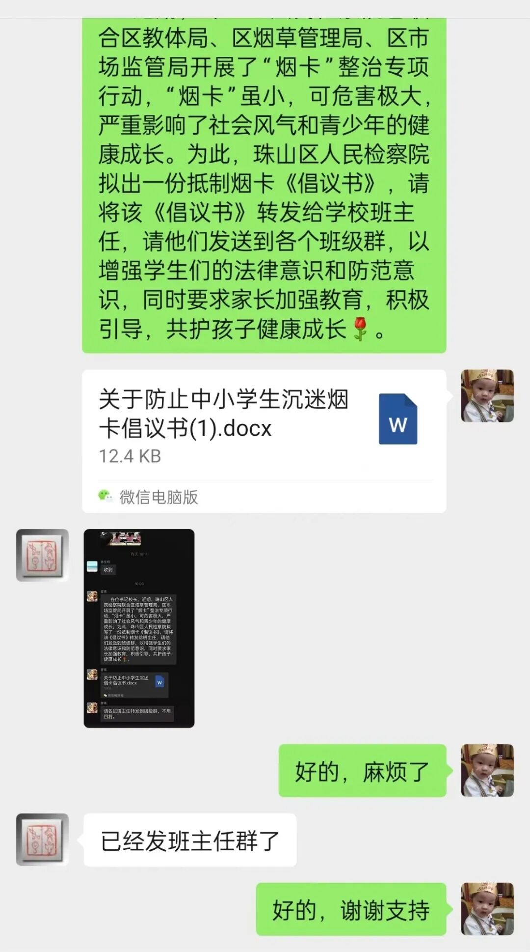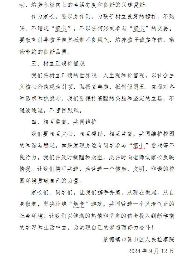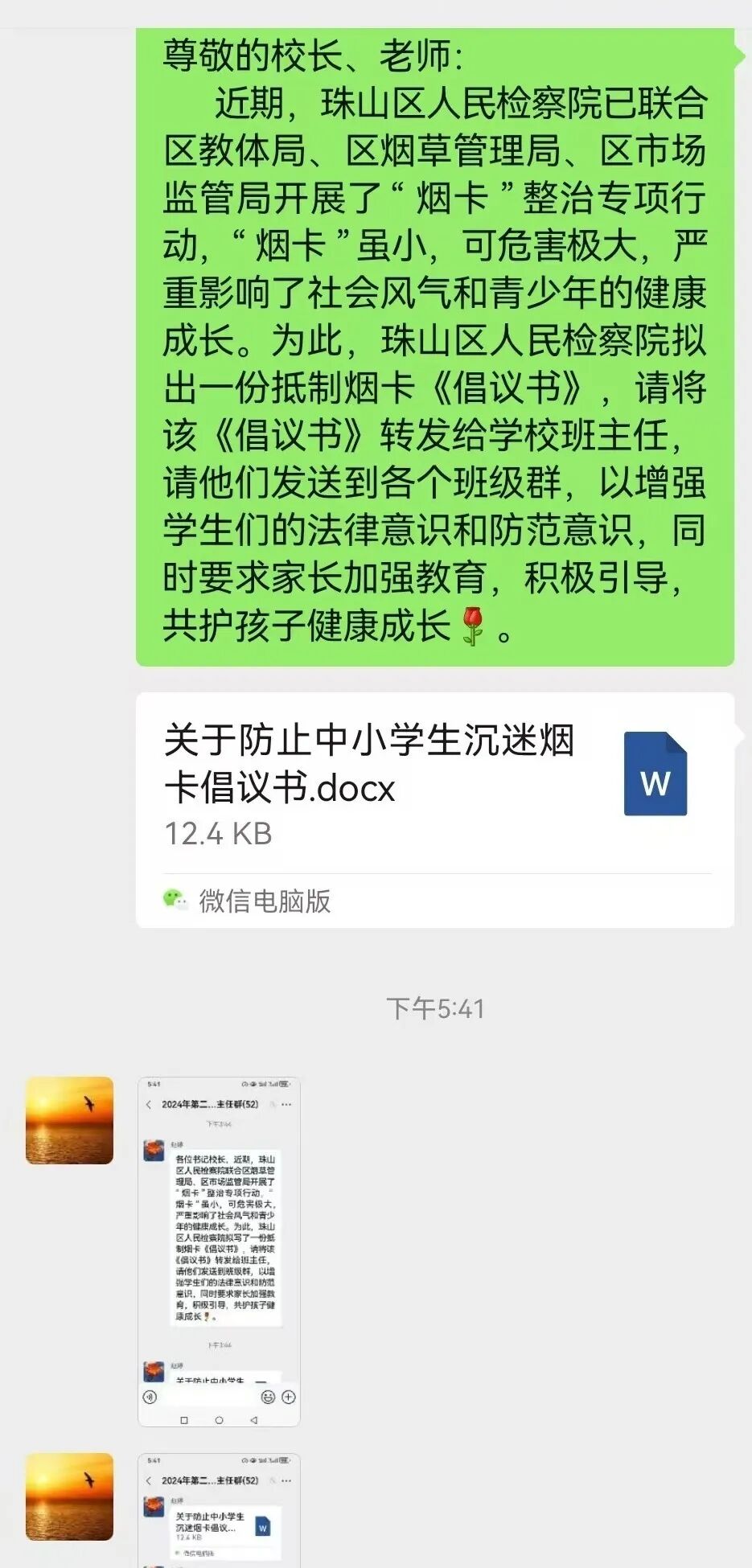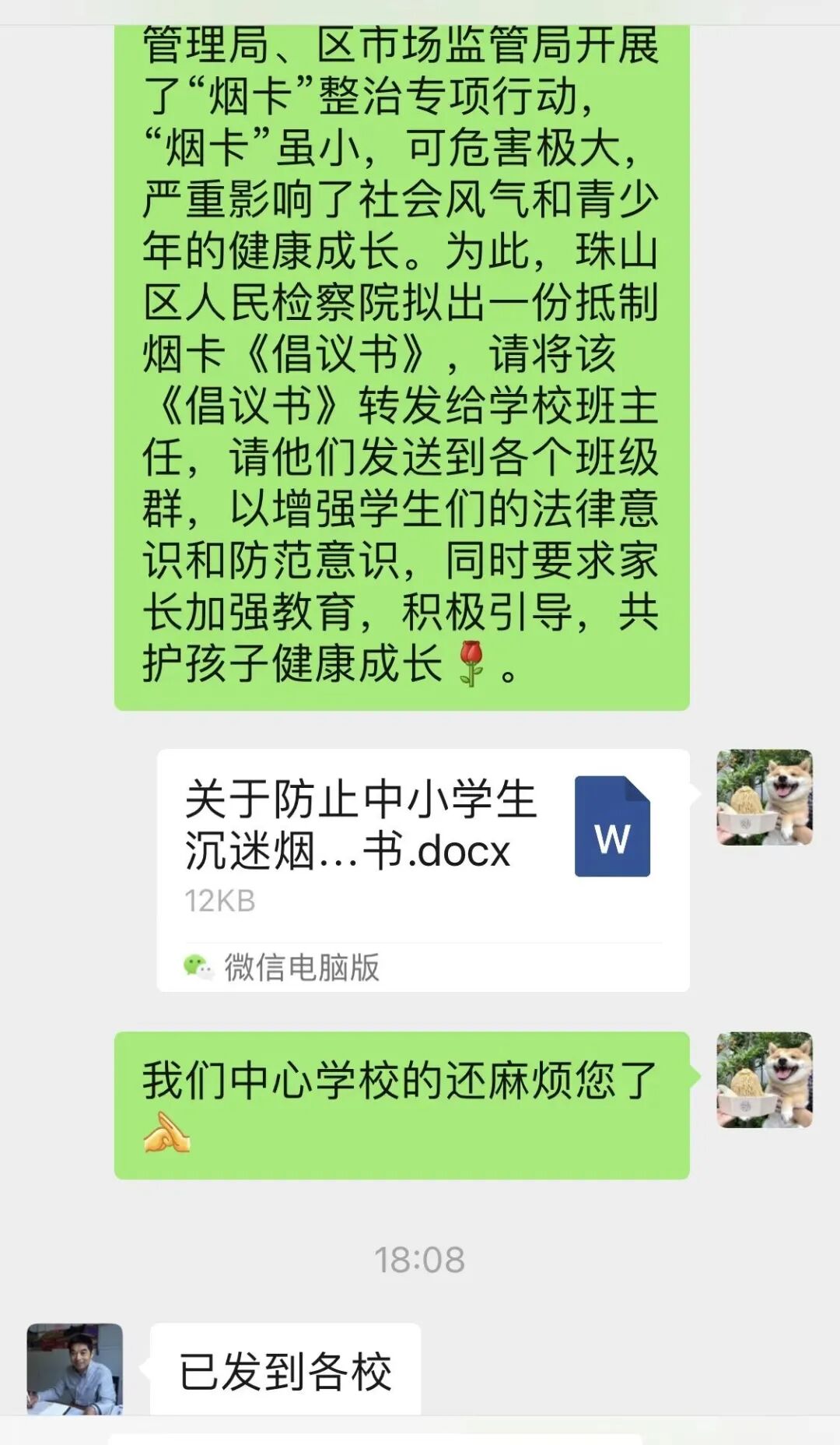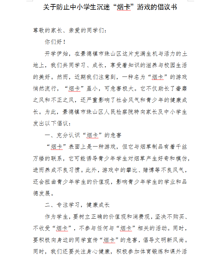 珠山区人民检察院通过法治副校长面向学校、家长发出《关于防止中小学生沉迷烟卡倡议书》,以增强学生们的法律意识和防范意识,同时要求家长加强教育,积极引导。
