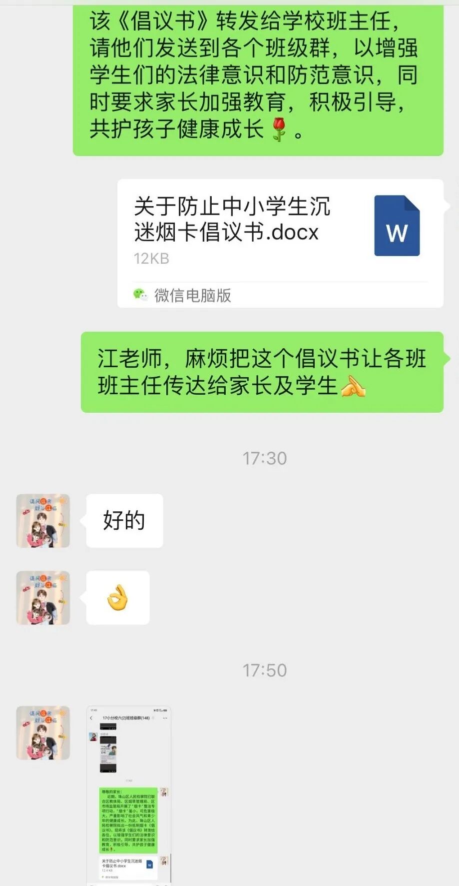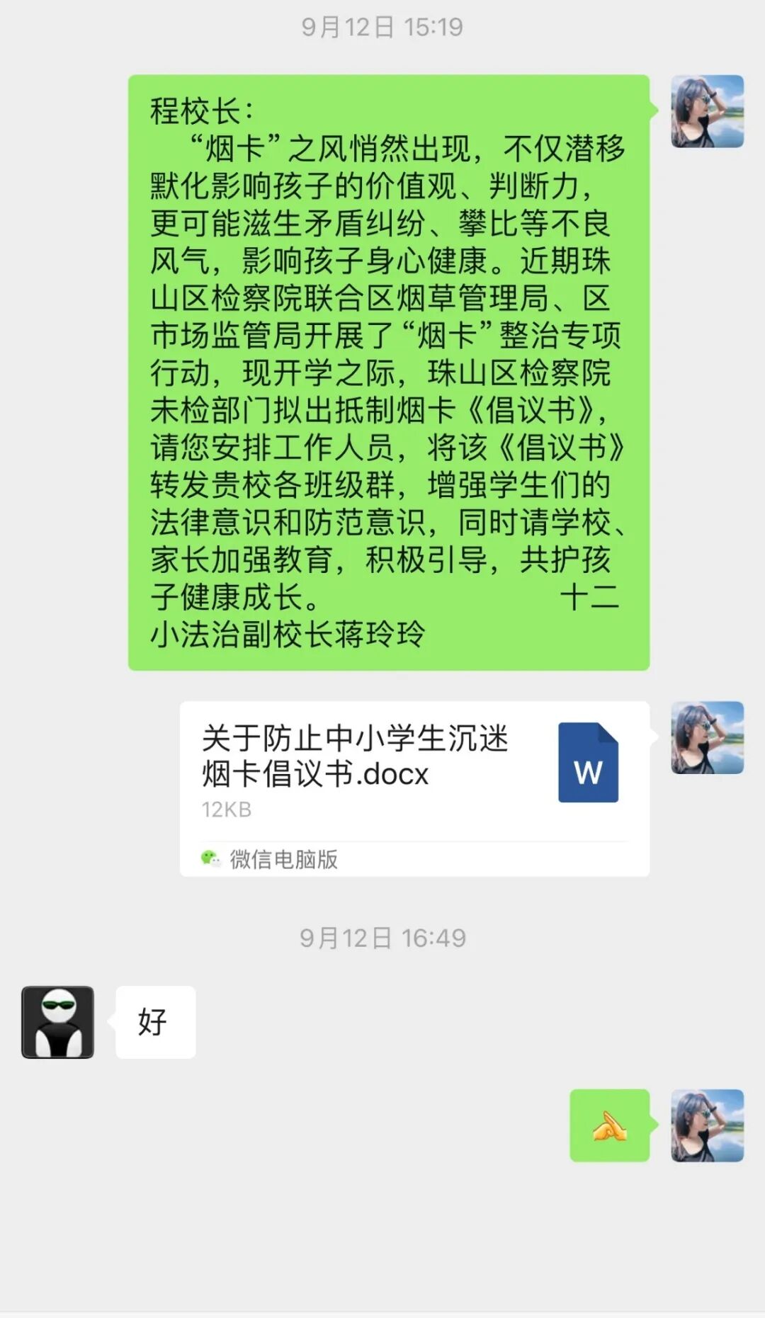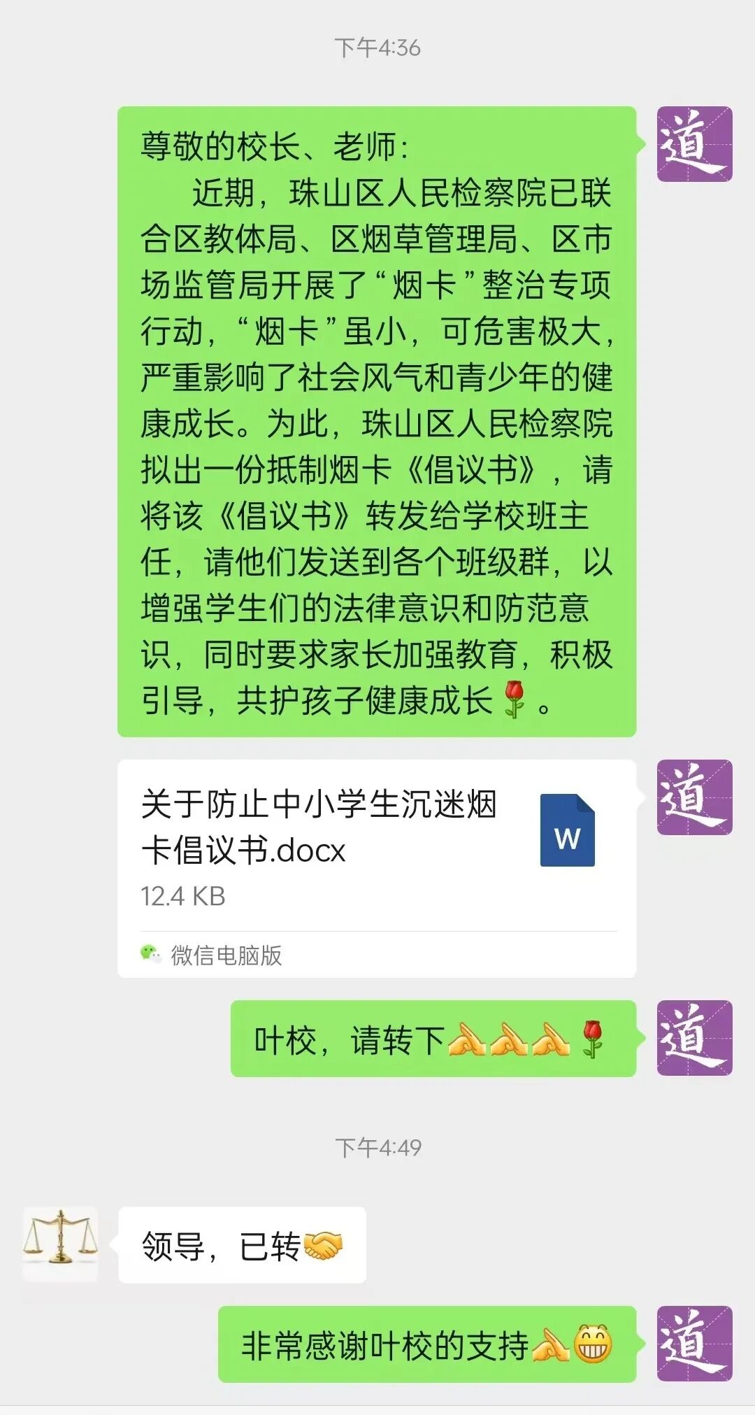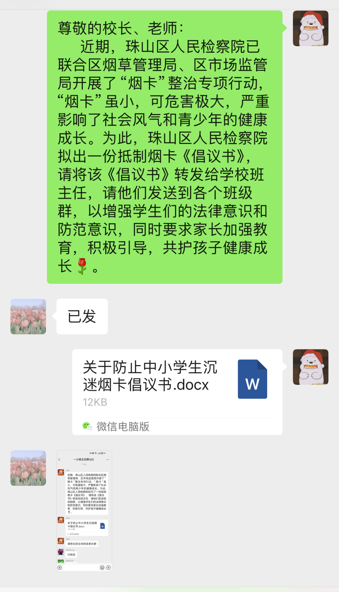 珠山区人民检察院通过法治副校长面向学校、家长发出《关于防止中小学生沉迷烟卡倡议书》,以增强学生们的法律意识和防范意识,同时要求家长加强教育,积极引导。