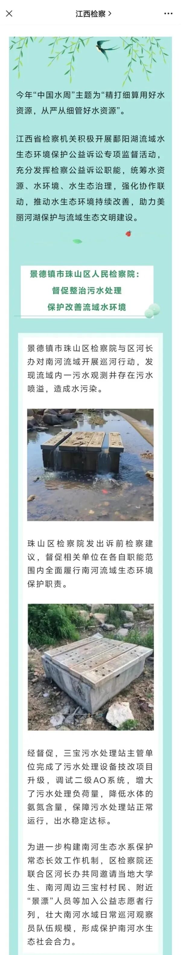 景德镇市珠山区人民检察院督促履行南河流域生态环境保护职责行政公益诉讼案入选江西省人民检察院《公益诉讼检察工作情况》2024年第3期鄱阳湖流域水生态环境保护专刊典型案例。
