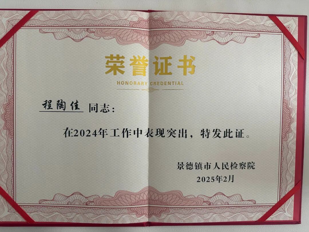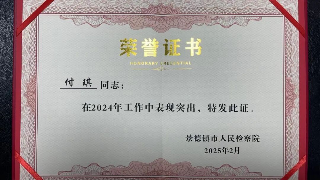 2月12日,景德镇市人民检察院召开全市检察长会议,珠山区人民检察院第三检察部获评“全市检察机关先进集体”,付琪及程陶佳同志获评“全市检察机关先进个人”。