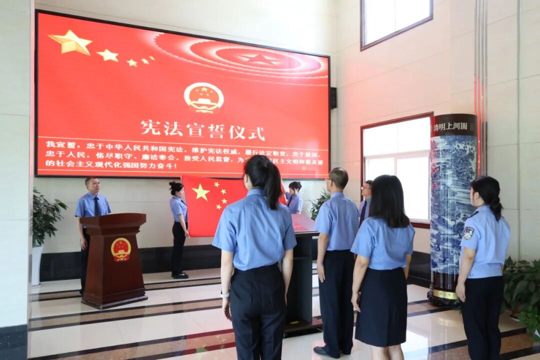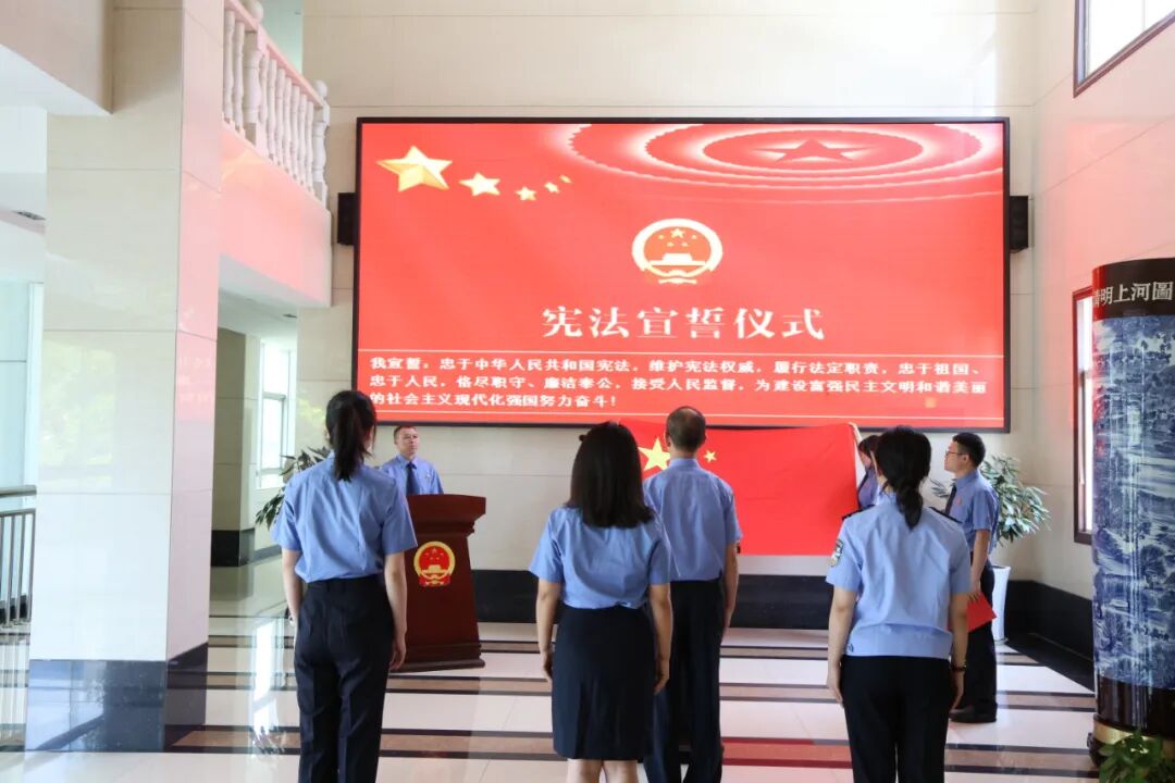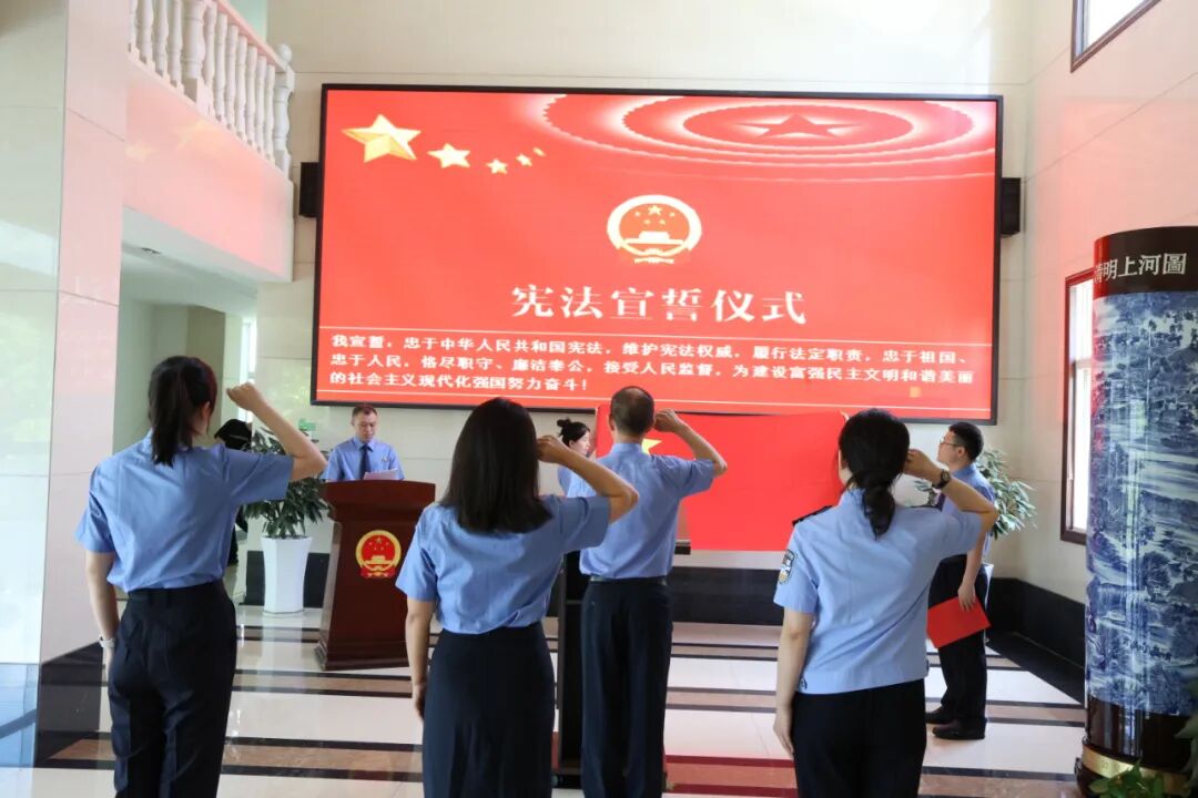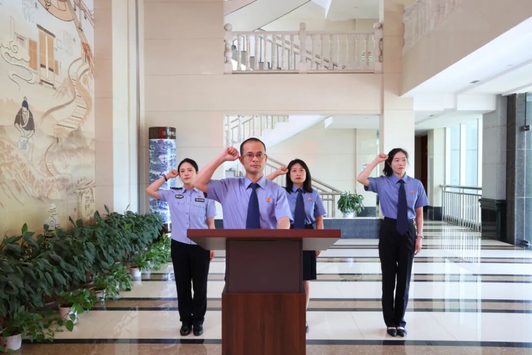 随后,领誓人朱建义左手抚按宪法,右手举拳,领诵誓词,其他人员跟诵誓词。“我宣誓:忠于中华人民共和国宪法,维护宪法权威,履行法定职责……”誓言铿锵,字字千钧,是他们对党和人民的郑重承诺,是对宪法权威的由衷敬畏,更是对检察事业的赤诚宣誓。